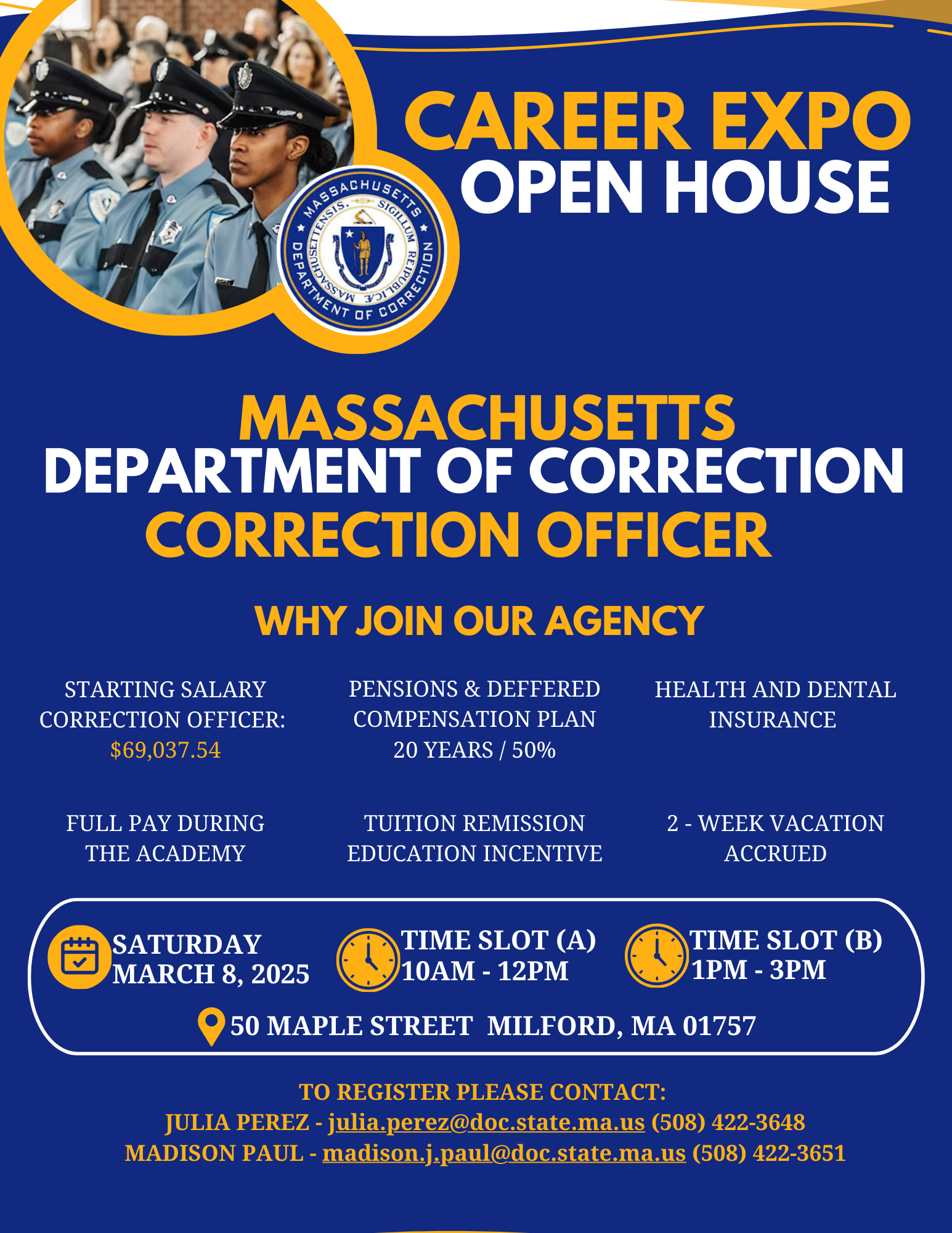 - This page, Massachusetts DOC Correction Officer Open House, is offered by