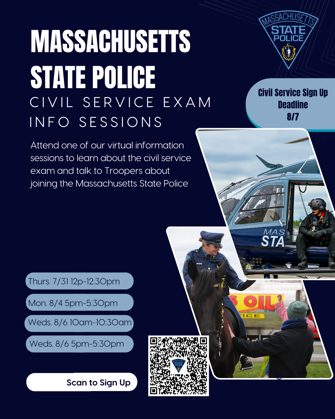 Join the MSP Recruitment Team to learn about the path to becoming a Massachusetts State Trooper in advance of the September Civil Service Exam.   Deadline to sign up for the Civil Service Exam is August 7, 2025.