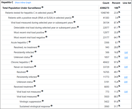 Continuity of Caredisplays summarize patient engagement and retention in care indicators and enable generation of patient level information for select conditions to support clinical management. “Line lists” containing patient-level information will only be accessible to users at the practice level through their facility-specific ESP server and only to those individuals granted specific access by their agency’s designated account approver.