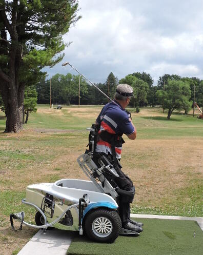 The ParaGolfer is an all-terrain power wheelchair that raises you into a standing position. It allows you unrestricted shoulder movement and a more conventional golf swing. People with high level spinal cord injuries often use this type of golfing wheelchair, but anyone with mobility or stability limitations can use it.