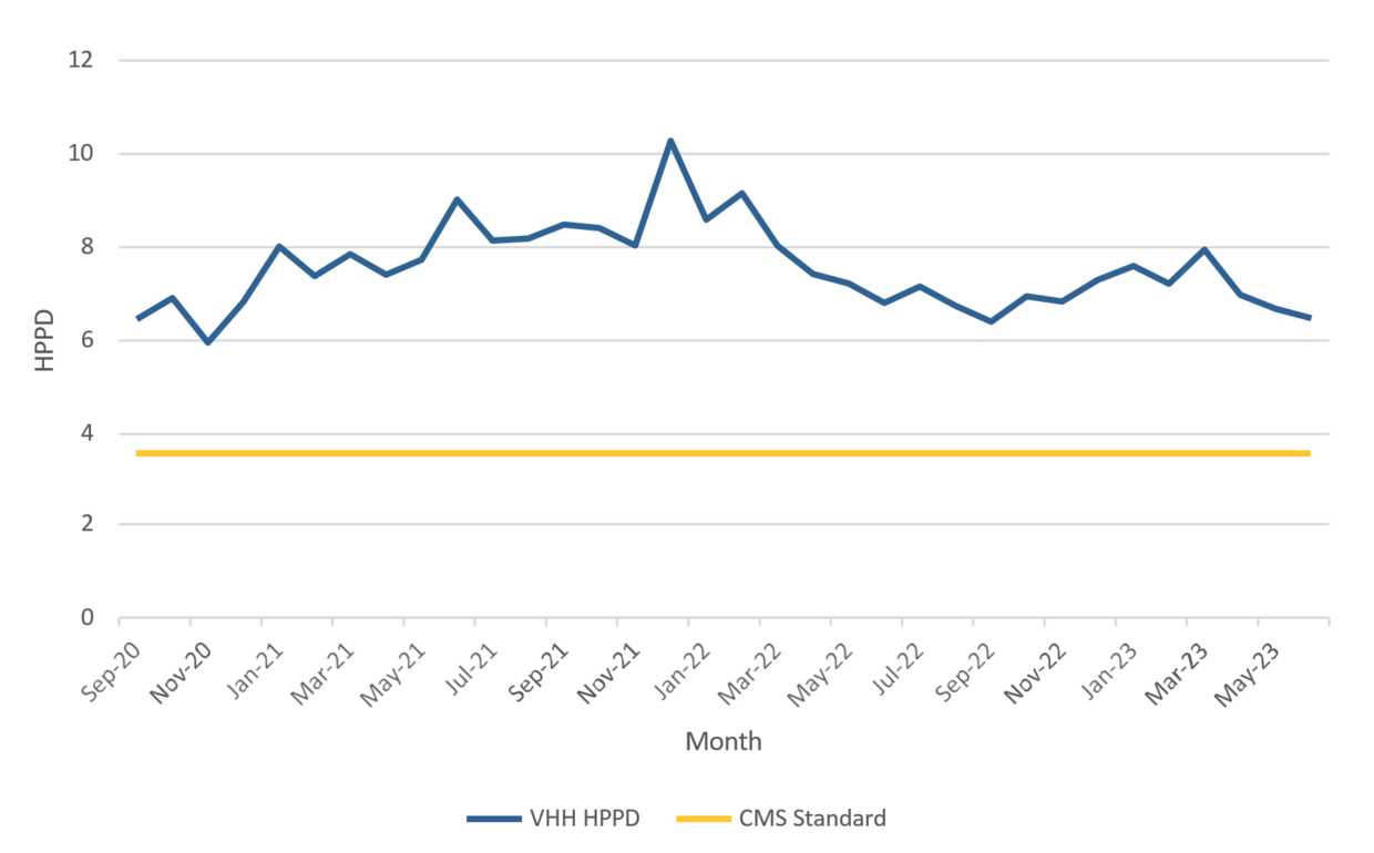 There have been a number of reports including “COVID-19 Outbreak at the Soldiers’ Home in Holyoke” from Mark W. Pearlstein; the Commonwealth’s OIG’s report titled “Holyoke Soldiers Home, May 2016 to February 2020”; and a previous audit (Audit No. 2017-0065-3S), issued December 14, 2017 by the Office of the State Auditor, which all looked into staffing levels at VHH because of multiple complaints of low staffing and concerns about veteran safety. In order to make sure this high-risk concern was addressed, our auditors researched staffing ratios in Massachusetts and other states. In addition, we held several interviews with upper management; nursing staff members; and the director of nursing, who is responsible for scheduling, to understand how VHH staffs each unit and shift. We collected staffing reports, variance reports, and daily rosters for the audit period. After compiling all the documentation, researching regulations, and reviewing past audit reports, we determined that there is a low risk that VHH is not meeting the federal staffing ratios. Below are the average hours per patient day (HPPD)3 by month at VHH compared to the Massachusetts requirements of 3.58 HPPD set forth in Section 150.007(B)(2)(d) of Title 105 of the Code of Massachusetts Regulations (CMR).
