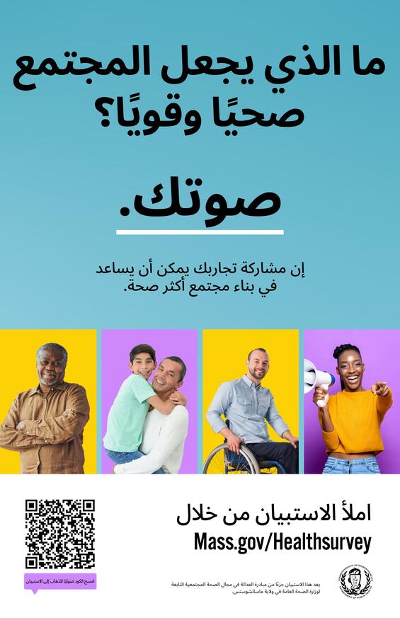هل تريد إخبار إدارة الصحة العامة في ولاية ماساتشوستس بكيفية تلبية الاحتياجات الصحية لمجتمعك؟ شارك في الاستبيان المجتمعي عن العدالة الصحية. www.mass.gov/healthsurvey