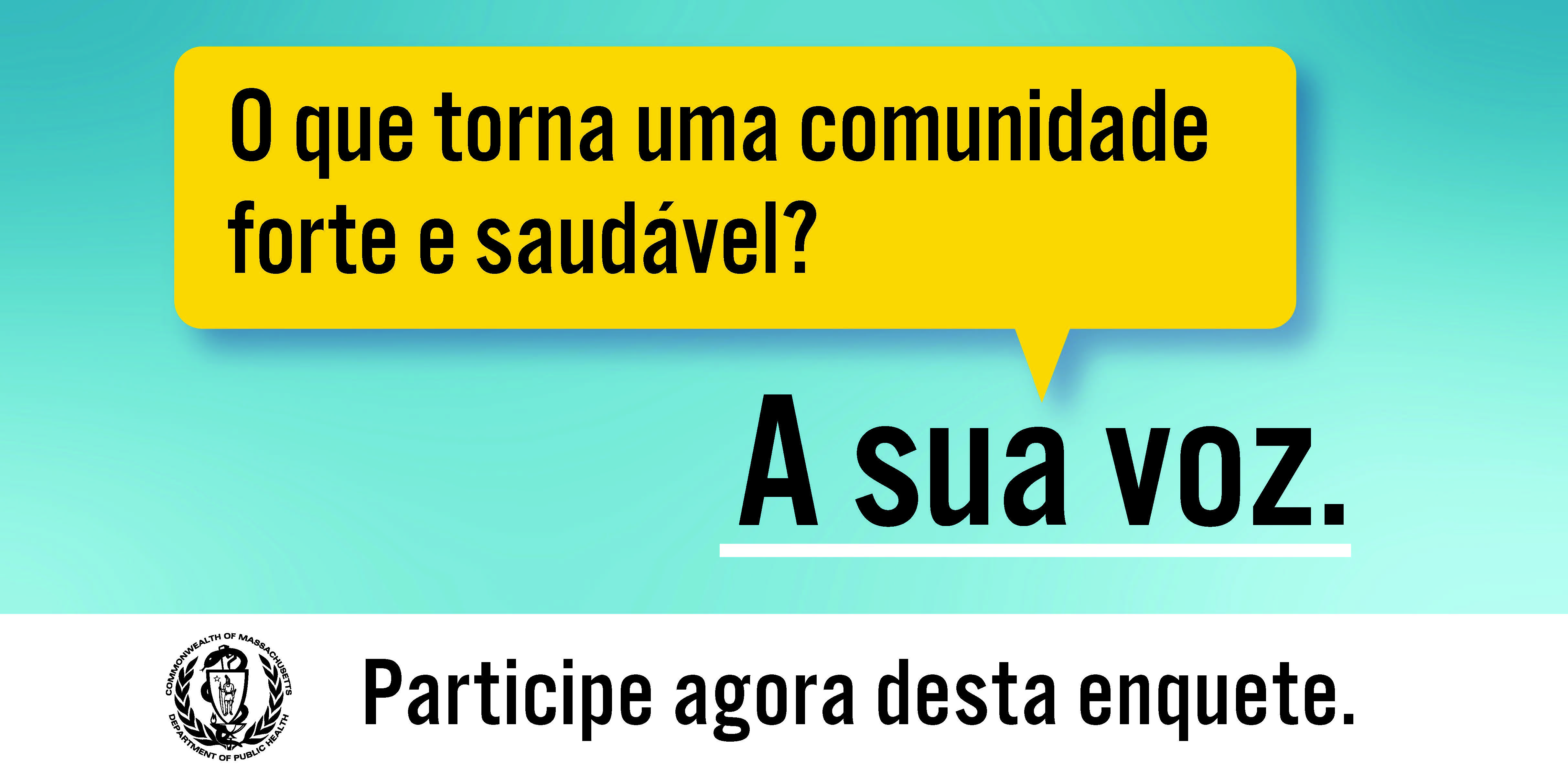 Deseja dizer ao MA-DPH como atender melhor às necessidades de saúde de sua comunidade? Participe da Pesquisa de Equidade em Saúde Comunitária. www.mass.gov/healthsurvey