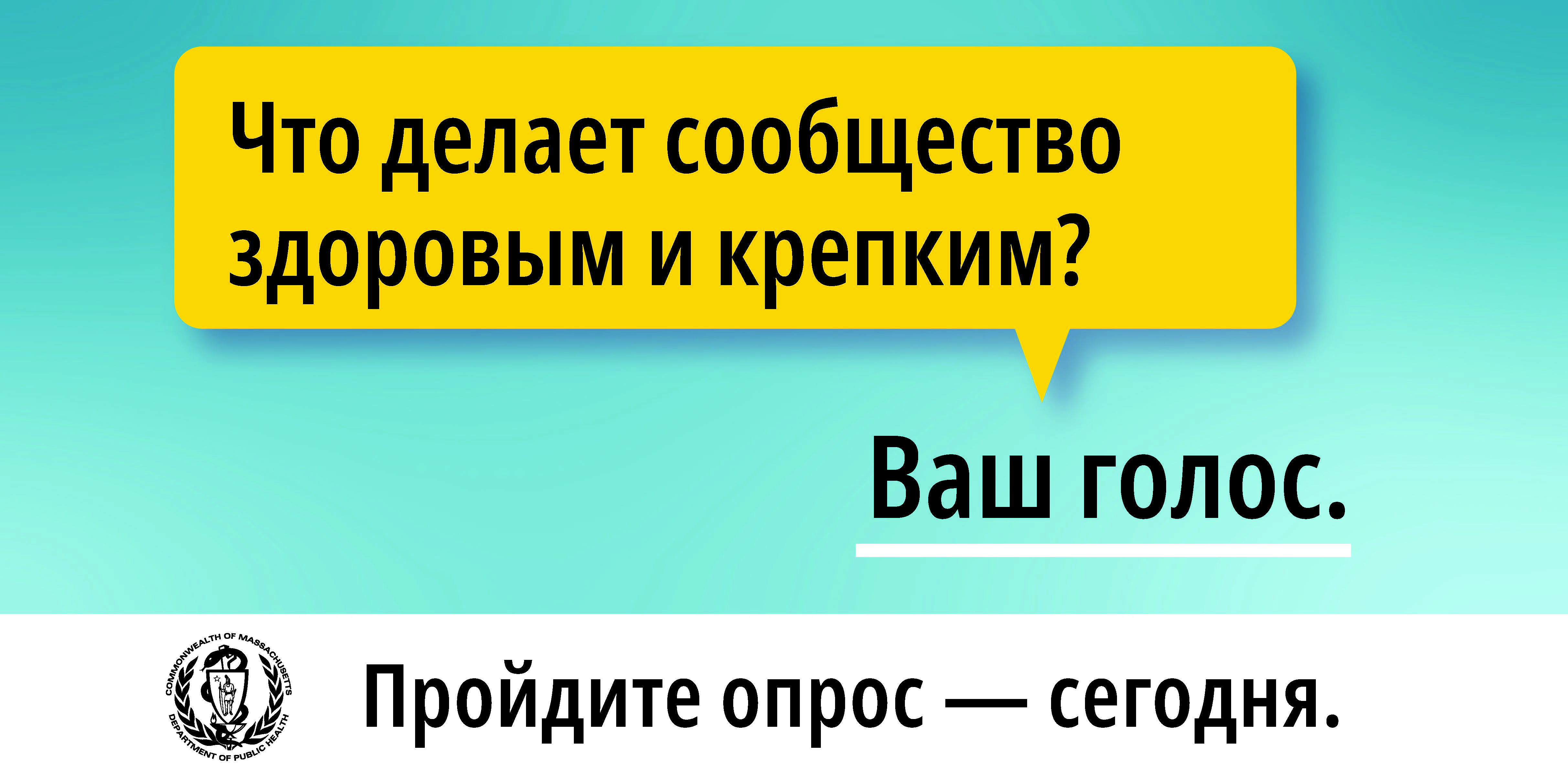 - Вы уже приняли участие в Опросе об обеспечении равенства доступа населения к здравоохранению? Это помогает информировать о новых решениях проблем сообщества. Пройти Опрос. www.mass.gov/healthsurvey