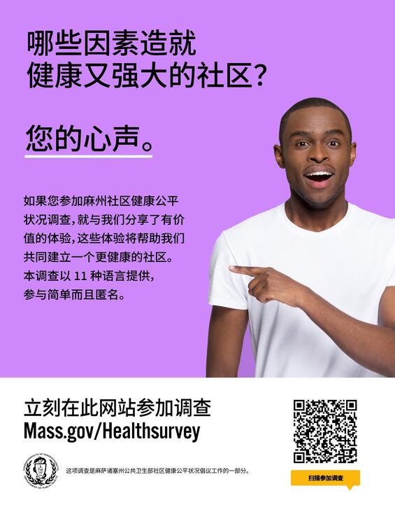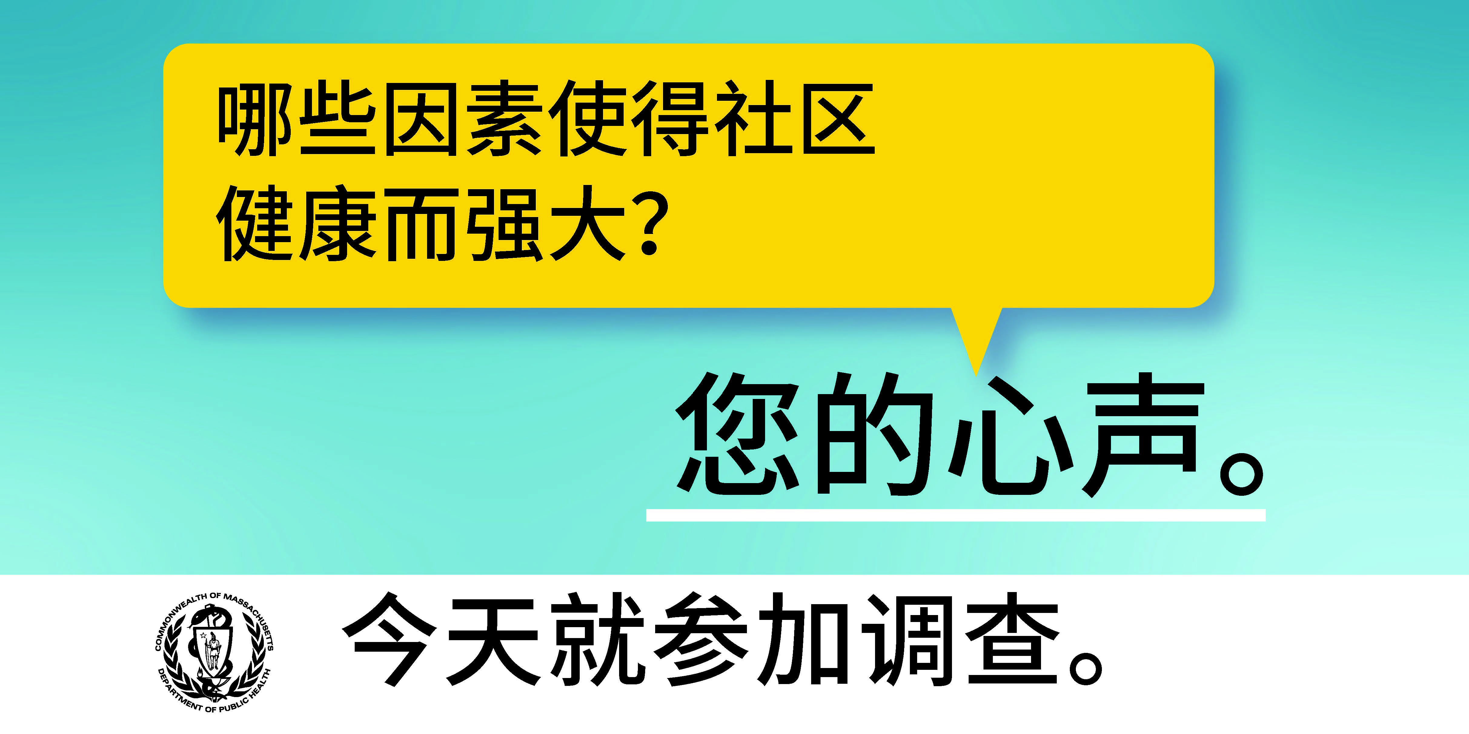 - 您的经历可以塑造我们未来的健康。请参与社区健康公平调查,分享您的经历。www.mass.gov/healthsurvey