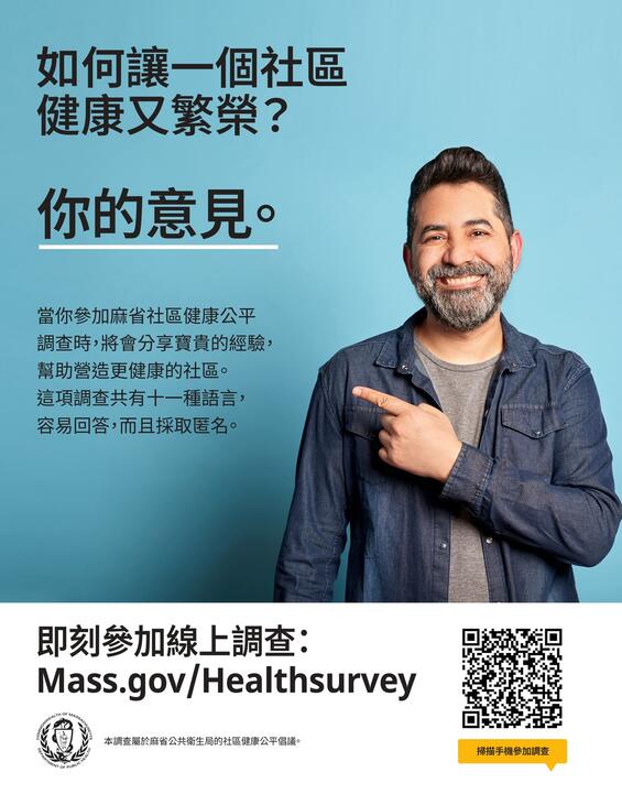 - 您的經歷可以塑造我們未來的健康。請參與社區健康公平調查,分享您的經歷。www.mass.gov/healthsurvey