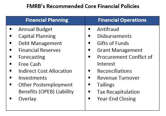The Financial Management Resource Bureau (FMRB) recommends that cities and towns adopt a set of core financial policies. These policies fall into two categories: financial planning and financial operations, as outlined below.