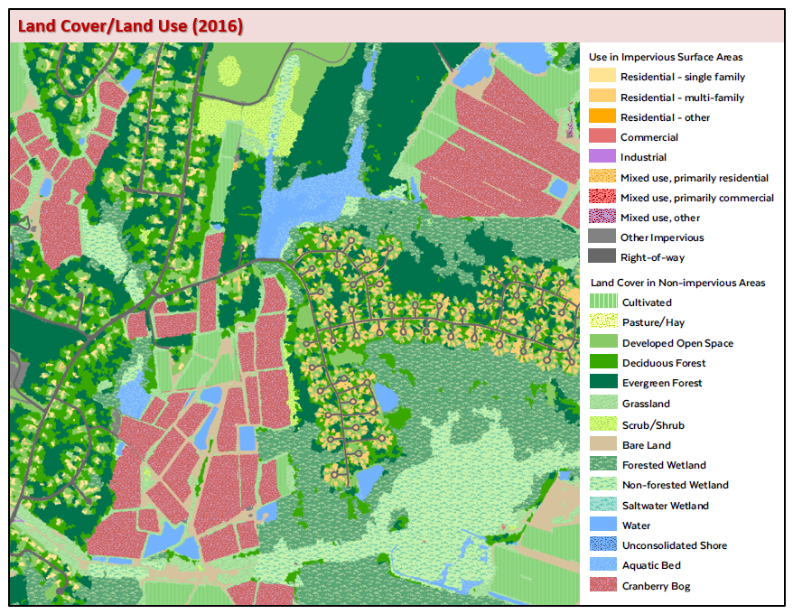Although both land cover and land use information are included, each of these aspects can be accessed independently, or in interesting and useful combinations with one another. For instance, a user can simply display impervious surfaces (land cover), or commercial parcels (land use). In combination, it is possible to display and measure the portions of the commercial parcels that are covered by impervious surfaces or the portions of residential parcels used as developed open space.