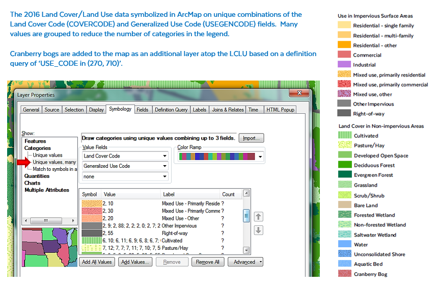 MassGIS includes a layer file for use in ArcMap 10.4+ and ArcGIS Pro with each download. (Users will need to apply the symbology or reset the data source for each download.) The LYR uses the 'Unique values, many fields' option with COVERCODE and USEGENCODE and symbolizes all impervious polygons (COVERCODE = 2) based on their generalized use code; all non-impervious land cover polygons are symbolized by their land cover category. The idea behind this method is to use both cover and use codes to provide a truer picture of how land is being used: parcel use codes may indicate allowed or assessed, not actual use; land cover alone (especially impervious) does not indicate actual use.