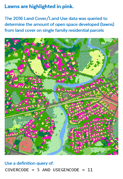 Specific combinations of land cover and land use categories may be queried for analysis and display. For example, users may want to determine the amount of lawns (open space developed, from land cover) on single family residential parcels by using a definition query of 'COVERCODE = 5 AND USEGENCODE = 11'.