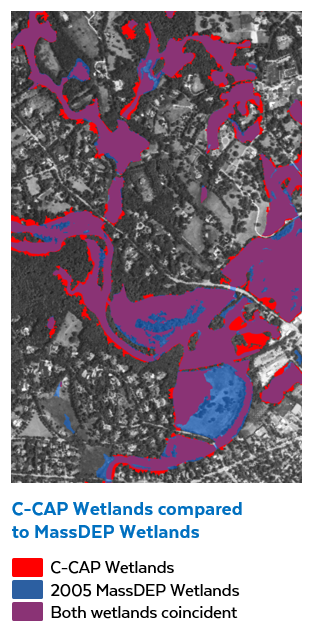 The wetlands in the final land cover product are exclusively from the C-CAP program, derived through a modeling process which used ancillary data such as Soils (SSURGO), the National Wetlands Inventory (NWI) and topographic derivatives, and in many locations will differ from the MassDEP Wetlands data.