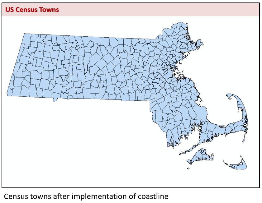 The downloaded Census geography files for Massachusetts included areas that extend into coastal waters. MassGIS incorporated a generalized coastline into the three layers (and the Census Towns layer) by removing areas flagged as water along the coast (using the LWFLAG attribute in the Census Faces data), interactively reviewing and editing select locations that remained visually incongruous with the 2021 aerial imagery, and re-adding a small number of modified areas identified as being entirely water but containing a non-zero population (indicative of “transient units” like house boats).