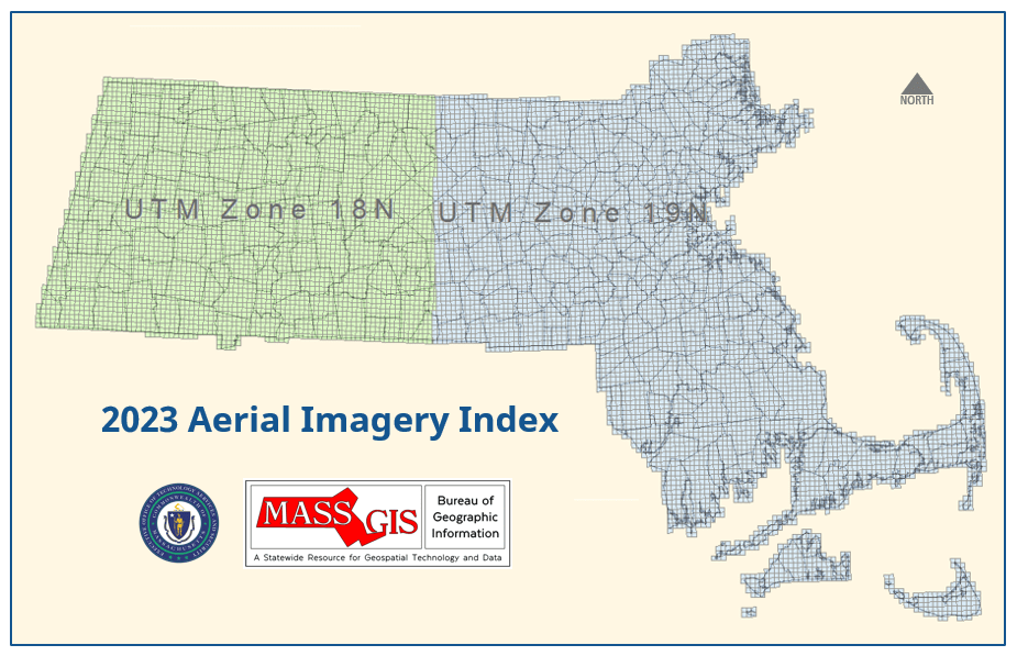 The GeoTiff/JPEG 2000 index polygons were delivered to MassGIS with the 2023 imagery from NV5, one index for each of the two UTM Zones (18N and 19N) that cover Massachusetts. MassGIS projected each layer to the NAD 1983 Mass. State Plane Mainland Meters coordinate system and merged them into this one feature class, and added some attribute fields. Note that MassGIS did not project the imagery; all imagery was kept in the original UTM projections as delivered by the USGS.