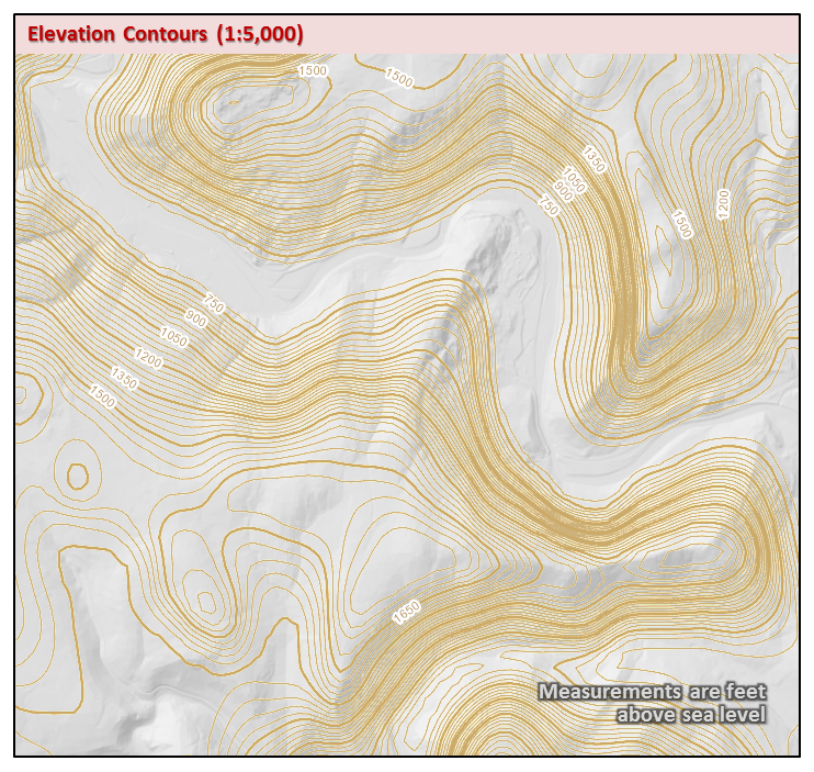 This datalayer had previously been a mix of data from the DTMs as well as some 1:25,000 Digital Line Graph (DLG) data obtained from the U.S. Geological Society. As of August 2001 all older USGS data have been replaced by the 1:5,000 product. In April 2003 data development was completed for the entire state. The ArcSDE layer is named CONTOURS5K_ARC.