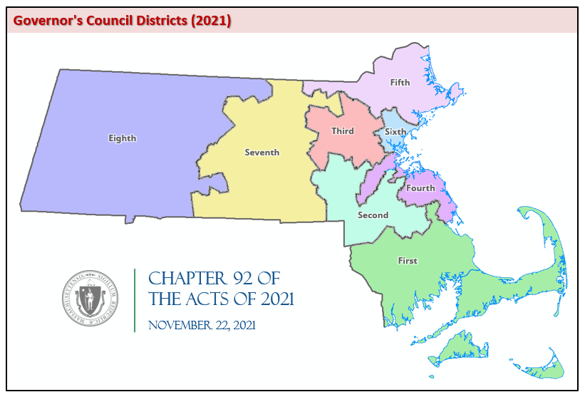 Staff at the Massachusetts General Court Special Joint Committee on Redistricting developed this layer. Governor Baker signed the new districts into law on November 22, 2021, with Chapter 92 of the Acts of 2021.