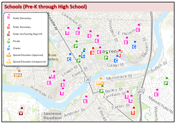 Schools appearing in this layer are those attended by students in pre-kindergarten through high school, based on the Massachusetts Department of Elementary and Secondary Education (DESE) school profiles database as of November 5, 2025. Categories of schools include public elementary, public secondary, public vocational/technical/agricultural regional, private, charter, and approved and unapproved special education.