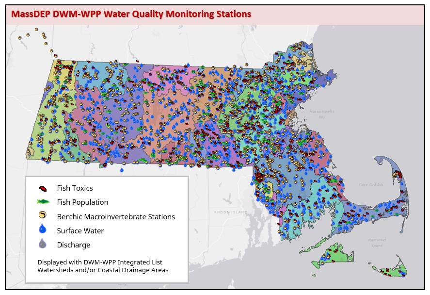 The Federal Clean Water Act (CWA) directs states to monitor and report on the condition of their water resources. The Water Quality Monitoring Stations data layer was compiled by MassDEP staff in fulfillment of CWA mandates. The stations data layer represents water quality monitoring locations sampled by WPP staff from 1983 to 2022.