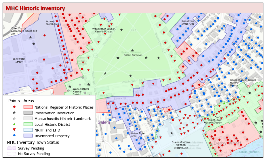 - The Inventory Points layer contains the locations of buildings, burial grounds, structures, and objects (e.g. statues, monuments, walls). The points layer is symbolized to indicate the most common historic designation types: 1) National Register of Historic Places, 2) local historic district, 3) both National Register and local historic district, 4) Preservation Restriction, 5) Massachusetts Historic Landmark (MA/HL) and 6) inventoried but not designated with one of the previous designations. Less common designations are not symbolized in MACRIS, but are included in the Designations attribute field (see below). MassGIS stores a copy of the point feature class as MHCINV_PT.