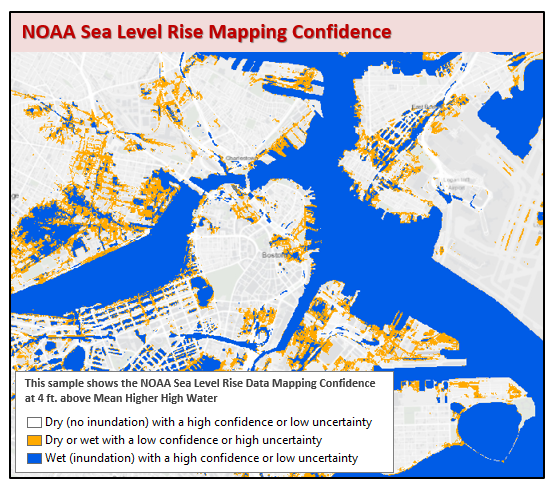 NOAA also published layers that depict the mapping confidence of the associated SLR inundation data, for the sea level rise amount specified (MHHW up to 10 feet). Areas that have a low degree of confidence, or high uncertainty, represent locations that may be mapped correctly (either as inundated or dry) less than 8 out of 10 times. Areas that have a high degree of confidence, or low uncertainty, represent locations that will be correctly mapped (either as inundated or dry) more than 8 out of 10 times or that there is an 80 percent degree of confidence that these areas are correctly mapped.