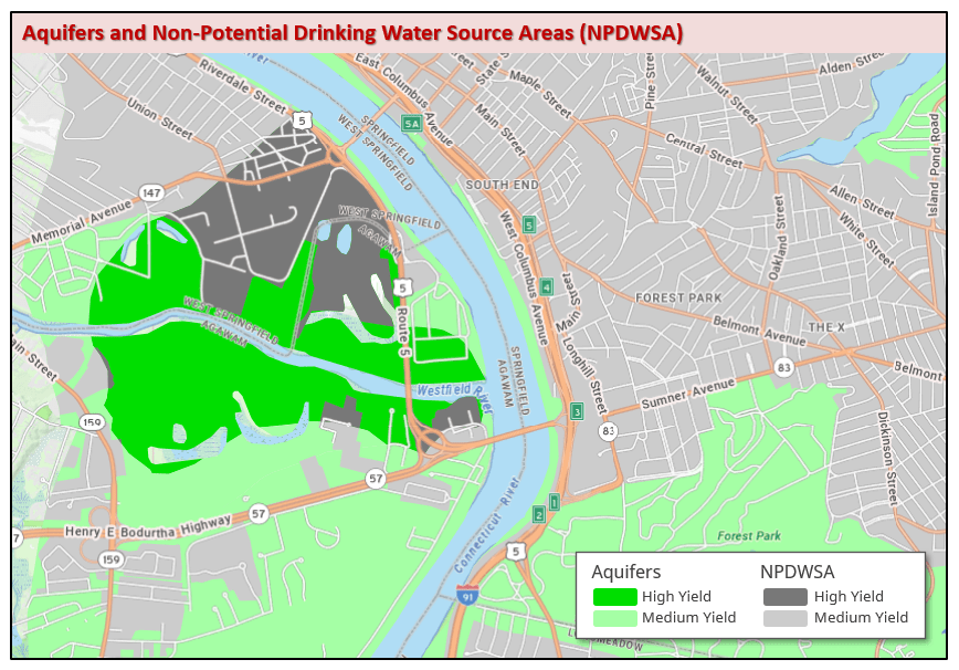 The Massachusetts Contingency Plan (310 CMR 40.0006) defines potentially productive aquifers and within those, non-potential drinking water source areas. Determination of NPDWSA is detailed in MassDEP policy WSC-97-701. These documents should be consulted for details regarding the regulatory framework in which this data was created and in which it should be interpreted.