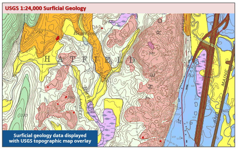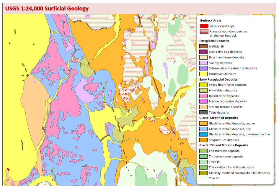 These data layers are part of a comprehensive study by the U.S. Geological Survey (USGS) to produce a statewide digital map of the surficial geology at a 1:24,000-scale level of accuracy. This compilation of surficial geologic materials defines the areas of exposed bedrock, and the boundaries between glacial till, glacial stratified deposits, and overlying early-postglacial and postglacial deposits. The database defines the distribution of nonlithified earth materials at the land surface and differentiates surficial materials of Quaternary age on the basis of their lithologic characteristics, constructional geomorphic features, stratigraphic relationships, and age. The purpose of this study is to provide fundamental geologic data for the evaluation of natural resources, hazards, and land information within the Commonwealth of Massachusetts.