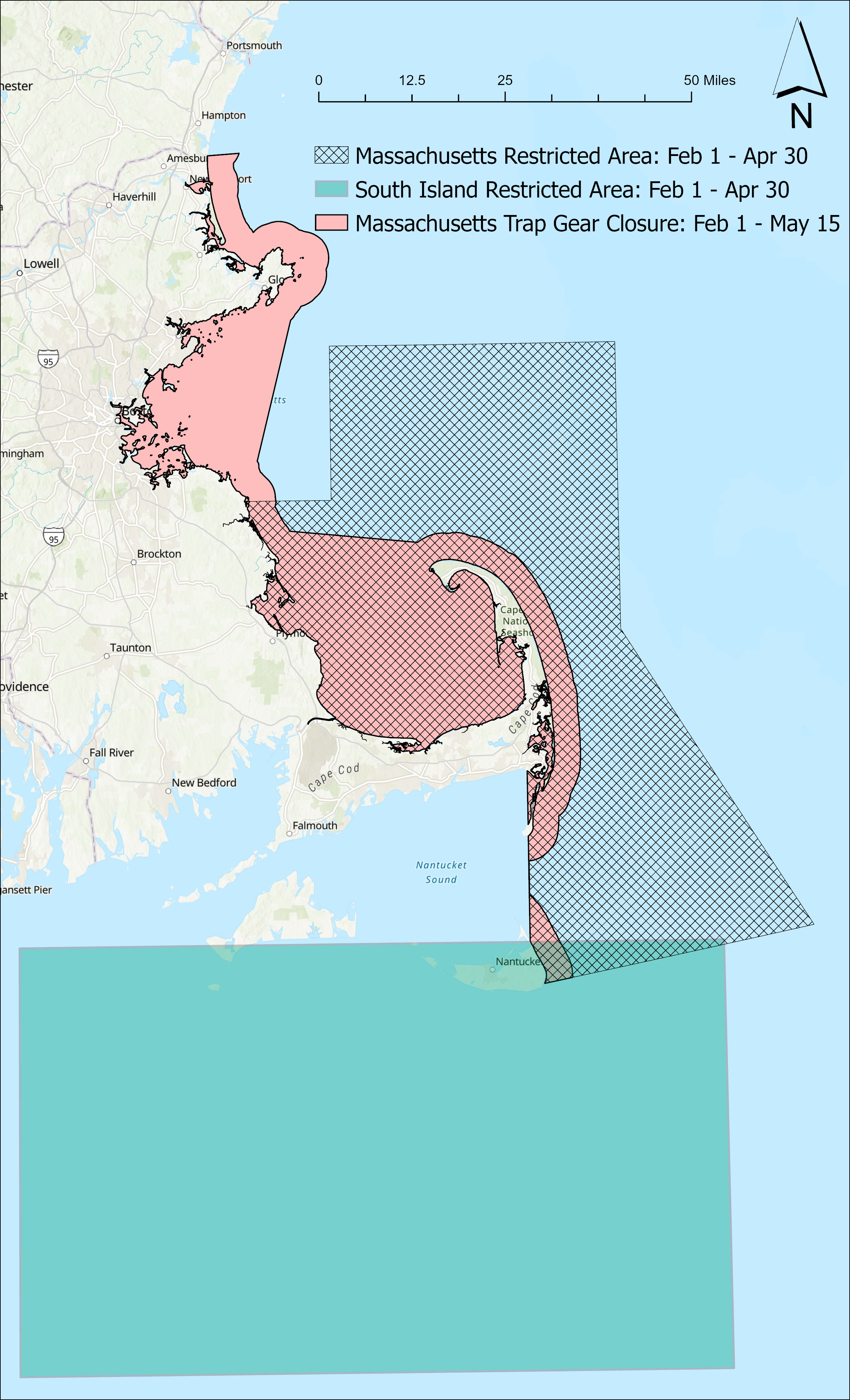 - DMF prohibits the setting of commercial trap gear in all state waters north and east of Cape Cod, including Cape Cod Bay, from February 1 – May 15. See Map