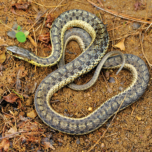 Common gartersnake: checkered with distinct yellow stripes