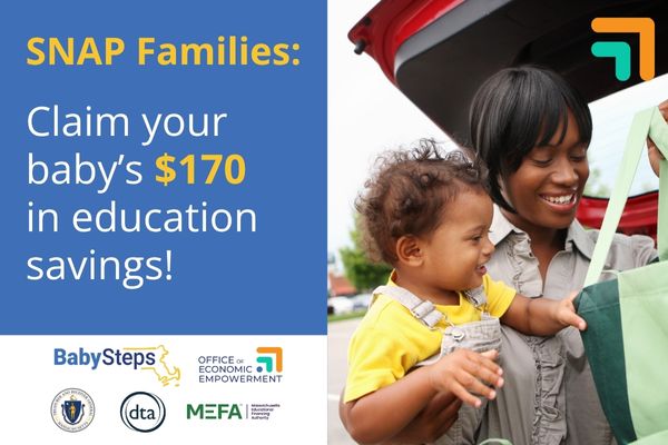 Through BabySteps, every child in Massachusetts can claim $50 to start a MEFA U.Fund 529 College Investing Account. Families enrolled in SNAP can claim an additional $120 through SNAP into BabySteps. Combined with the initial BabySteps deposit, that's a total of $170 to save for your children's future college and career training costs.
