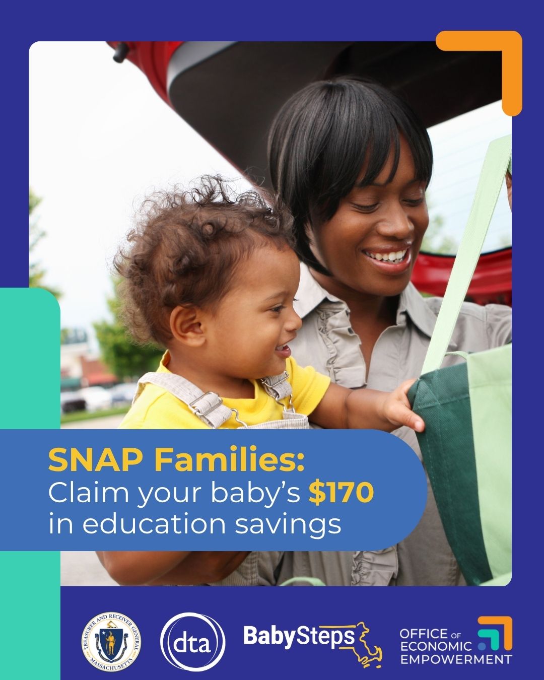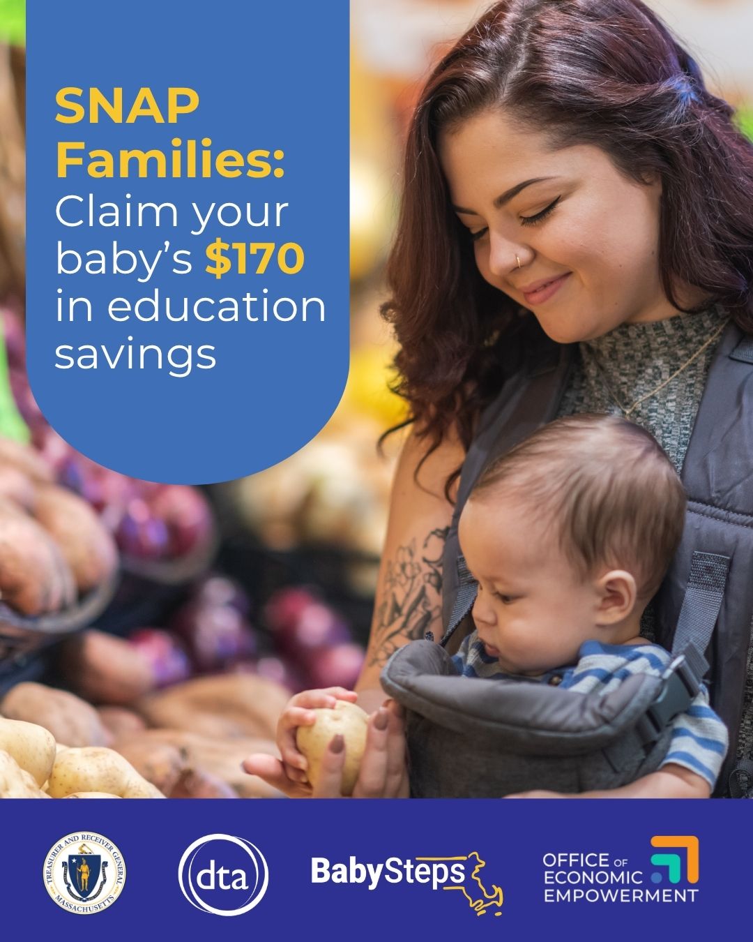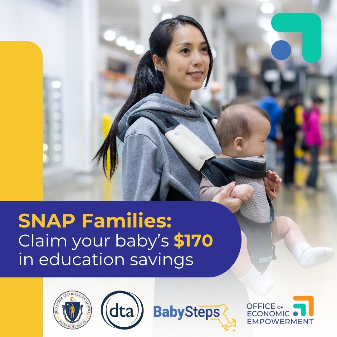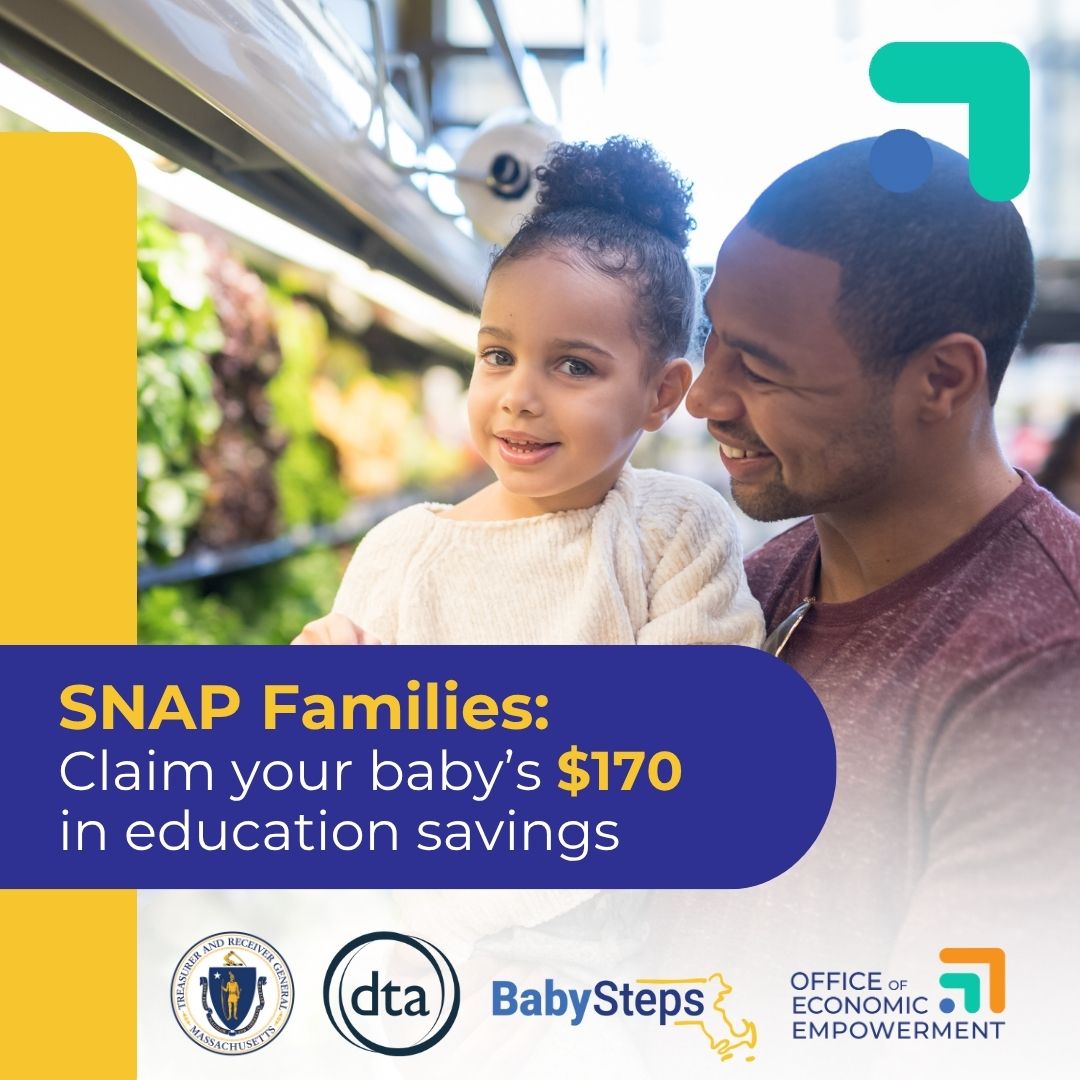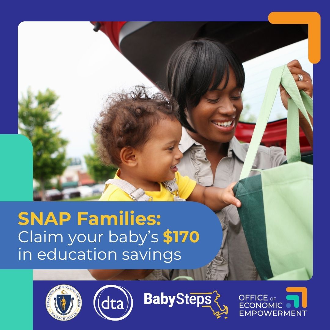 Attention SNAP Families ? Claim your child's $170 in education savings with SNAP into BabySteps from the Office of Economic Empowerment! Learn more and kickstart your savings today at mass.gov/SNAPintoBabySteps.
