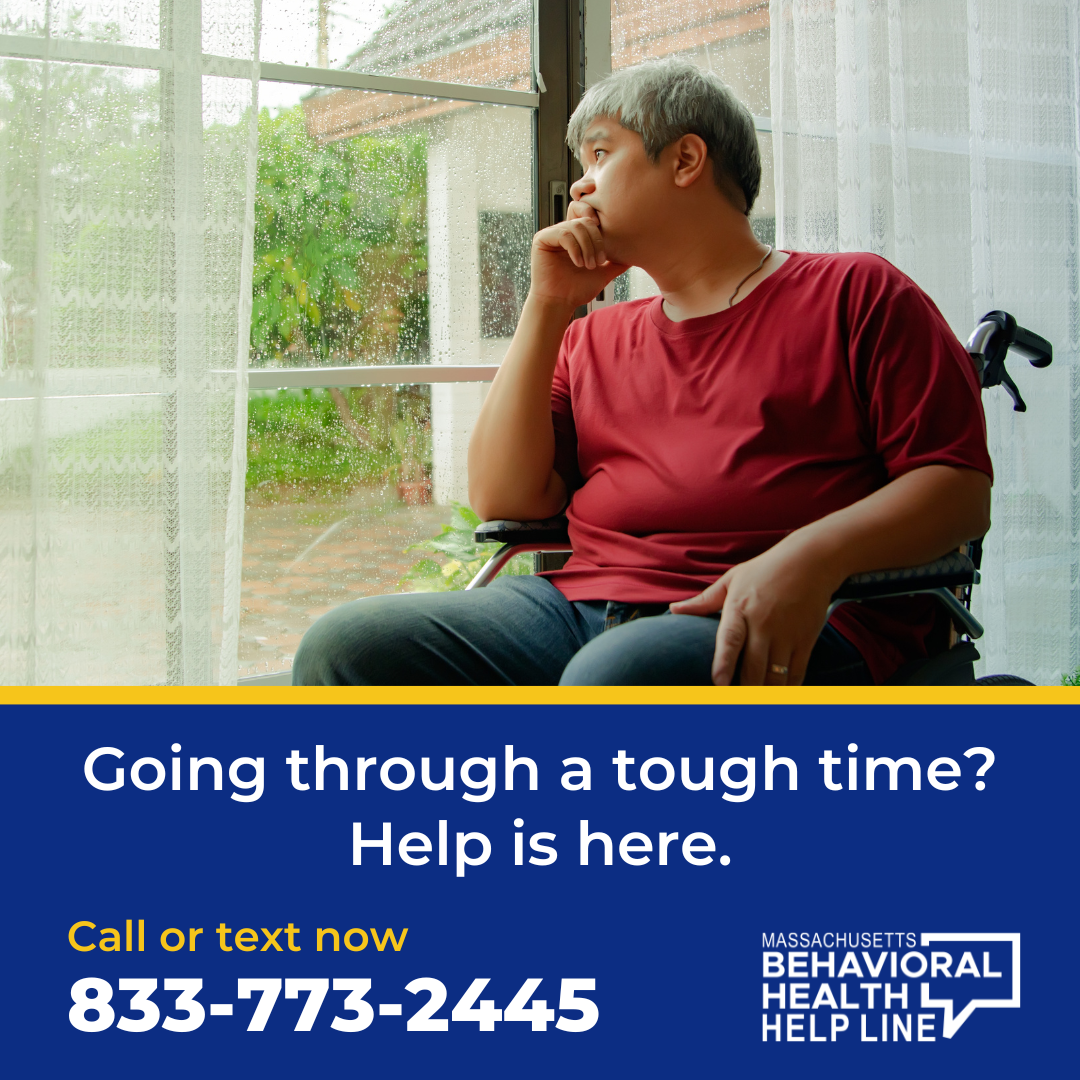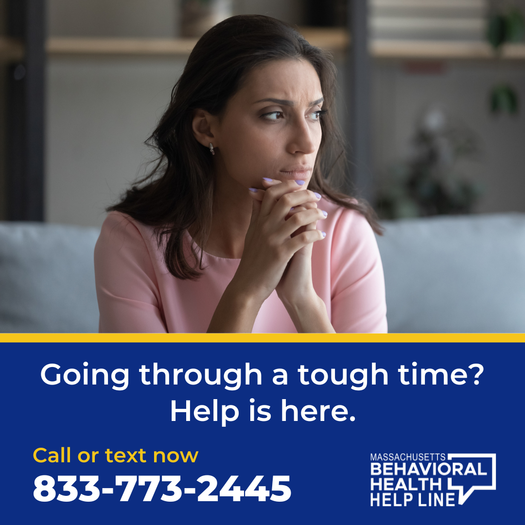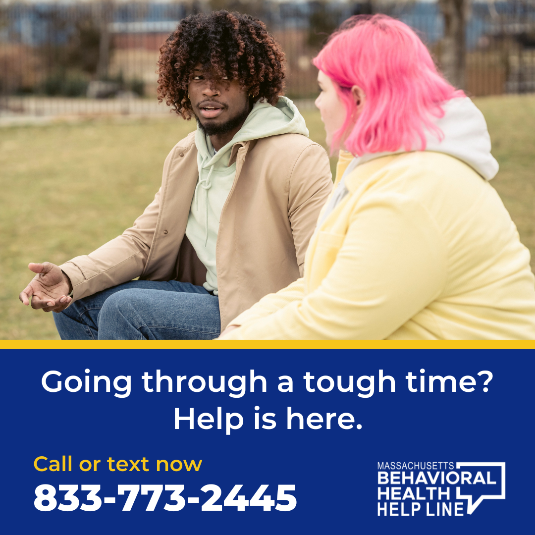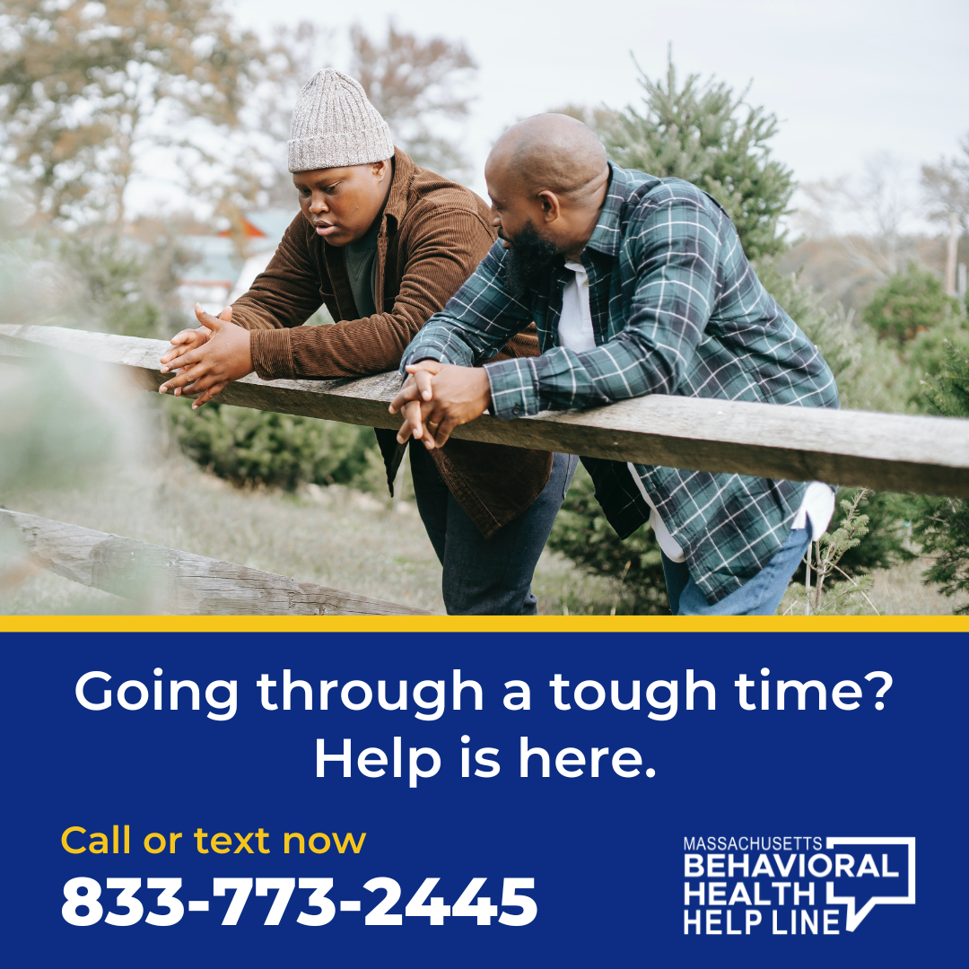 Life can be hard sometimes. If you or someone you know is struggling with mental health or substance use, call or text the Massachusetts Behavioral Health Help Line or visit a Community Behavioral Health Center. |