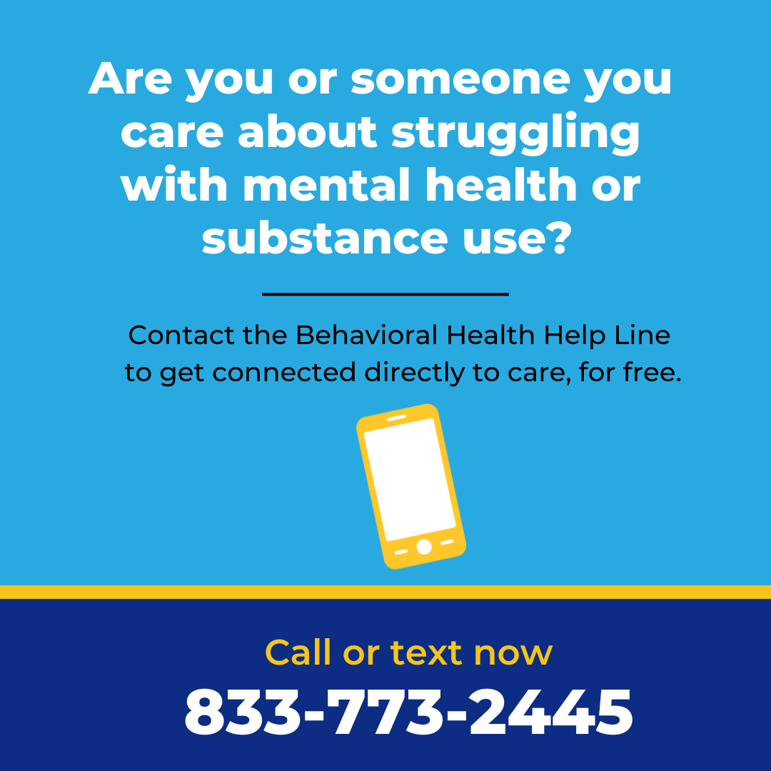When you need mental health or substance use help, talk to someone who knows how to help. Call or text the Behavioral Health Help Line (833-773-2245) and get directly connected to care, no insurance needed. |