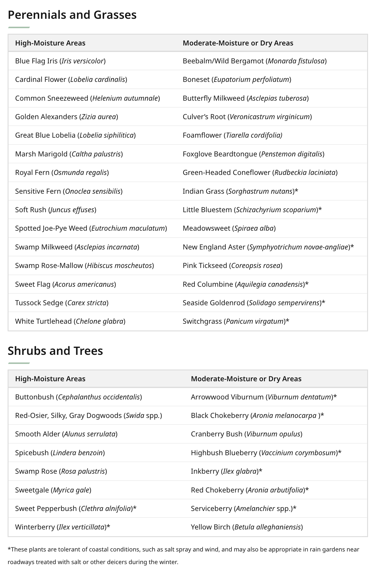 The native plants listed in the following tables are good choices for rain gardens. The plants are categorized by their suitability for high-moisture or moderate moisture/dry areas. For a printer-friendly version of this plant list, see Plant List for Rain Gardens (PNG, 390 KB).