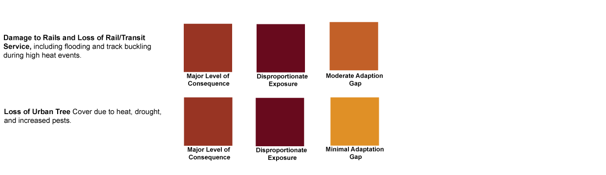 Damage to Rails and Loss of Rail/Transit Service is the most urgent Infrastructure sector impact in the region. For the Boston Harbor portion of commuter and freight rail lines, rail repair costs in response to extreme heat deforming rails are the second largest among regions in the state, behind only the Eastern Inland region. A recent study investigated measures of system resilience for the MBTA’s rail rapid transit system and found that the combined effects of sea level rise and increased coastal storm frequency could render significant portions of the network inoperable, with projected interruptions becoming more widespread and severe later in the century.