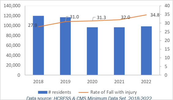 The rate of falls with injury increased from 27.9 falls with injury/1,000 residents in 2018 to 34.8 falls with injury /1,000 in 2022, an almost 25% increase.