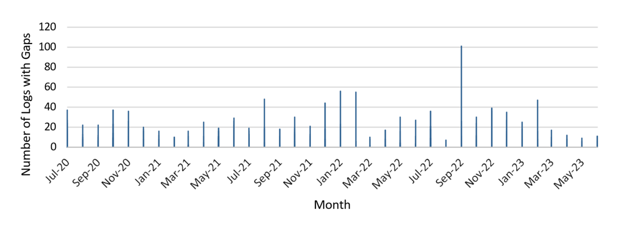 VHH could not provide documentation to prove that nurses performed intentional rounding on all veterans during the audit period. Specifically, 32 out of our sample of 35 (91%) veterans did not have complete intentional rounding logs. The 32 veterans accounted for 384 out of 562 (68.3%) intentional rounding logs that had gaps, indicating that rounding did not occur as required. Below is a chart showing the number of intentional rounding logs that had gaps. Each log accounts for one month of intentional rounding.
