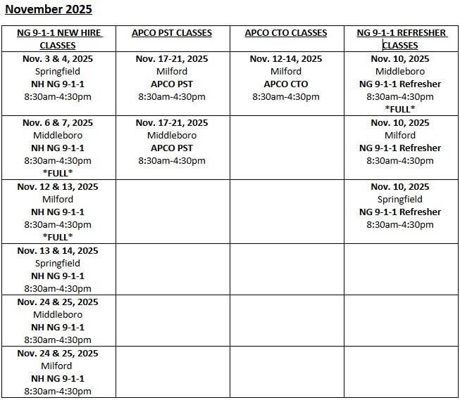 The scheduled trainings on the below calendars are only available for newly hired staff at a Massachusetts 9-1-1 call center.