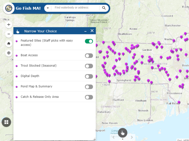 Plan your next fishing trip with MassWildlife's Go Fish MA! interactive map. Find boat ramps, trout stocked waters, pond and lake summaries, and digital depth information—plus over 100 featured fishing sites that offer easy access to great fishing. Launch map now!
