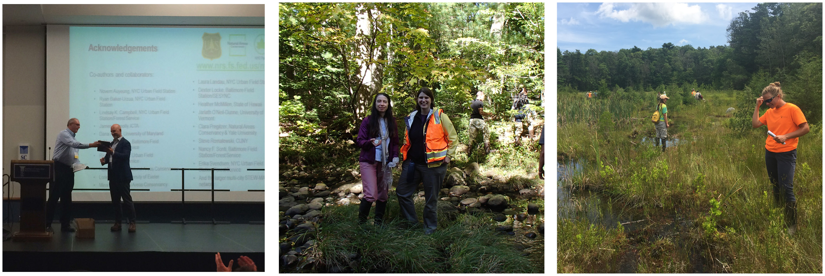 Photo Left to Right: Alex Hackman receiving the Award for Excellence in Restoration; Carrie Banks (on right) with fellow DER staff Cindy Delpapa; Eel River Headwaters Restoration – monitoring in 2017.