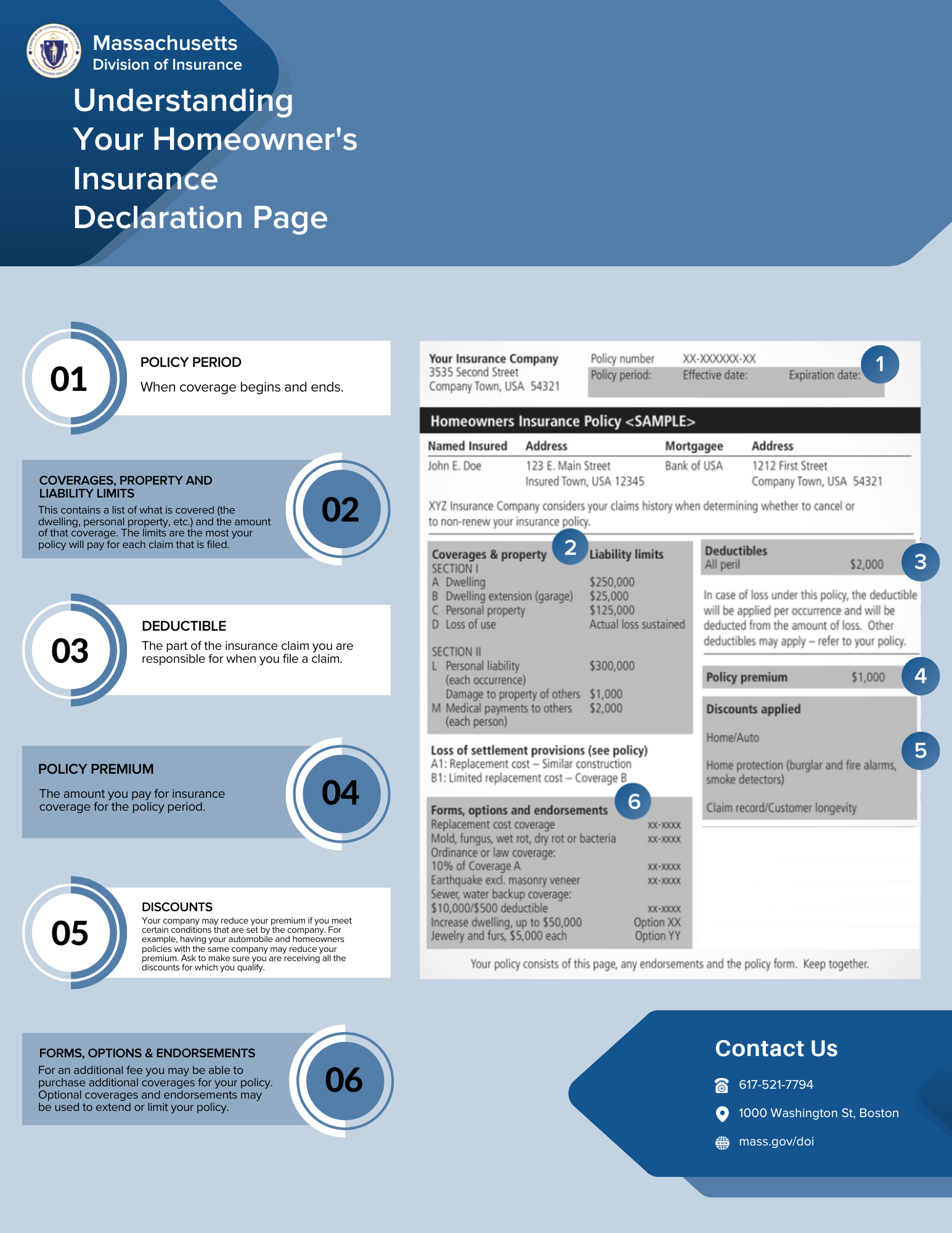 Consumers with questions or concerns about their insurance coverage are encouraged to contact the Division’s Consumer Services Unit at 617-521-7794 or visit the Division’s website on Home Insurance.