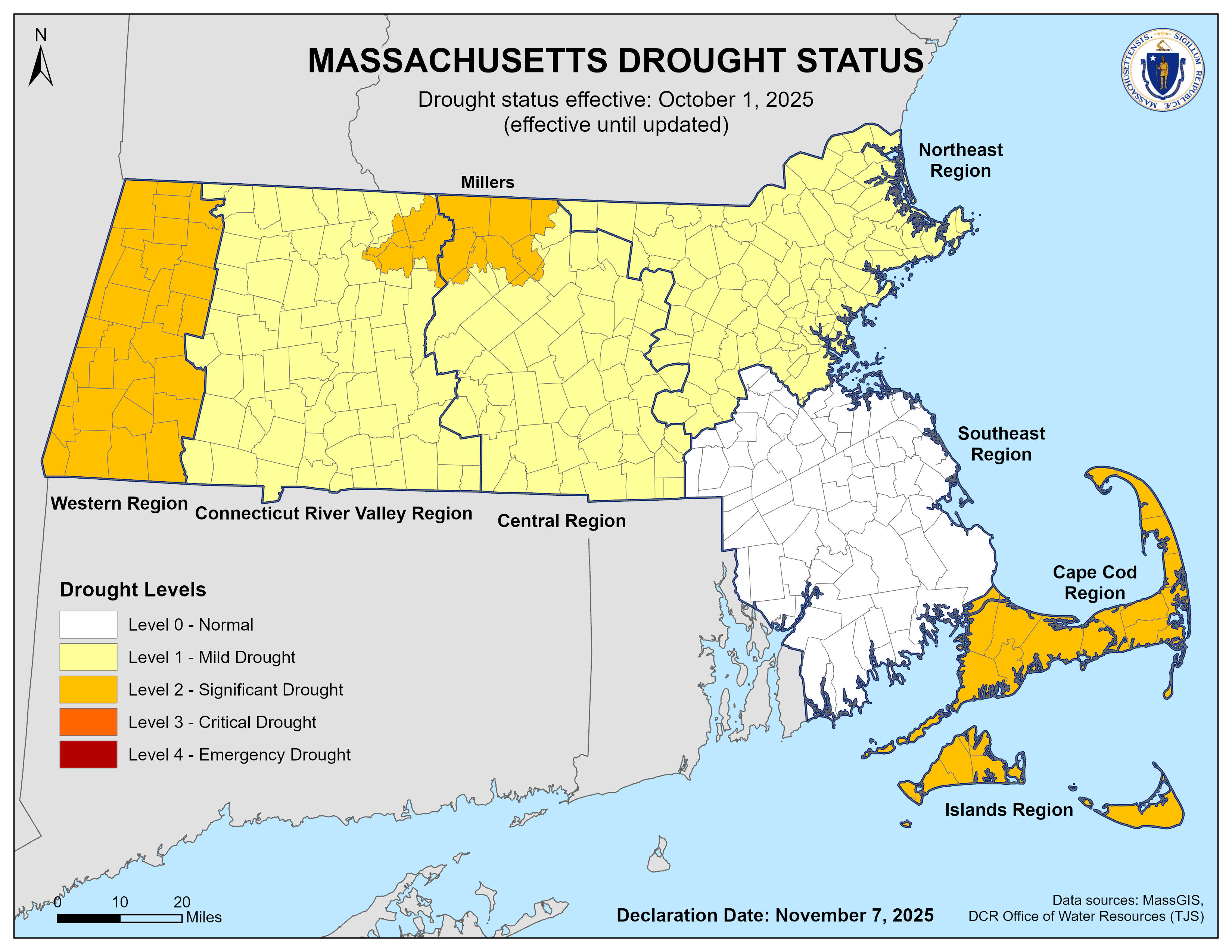 Boston — Today, Energy and Environmental Affairs (EEA) Secretary Rebecca Tepper declared the Southeast Region has returned to Normal Conditions. The Connecticut River Valley and Central Regions have improved to Level 1–Mild Drought. In the Islands Region, Nantucket has improved, while Martha’s Vinyard has worsened, both now at a Level 2-Significant Drought. The Deerfield Watershed improved to Level 1-Mild Drought, and the Millers Watershed improved to Level 2–Significant Drought. The Northeast, Cape Cod and Western Regions remain unchanged.