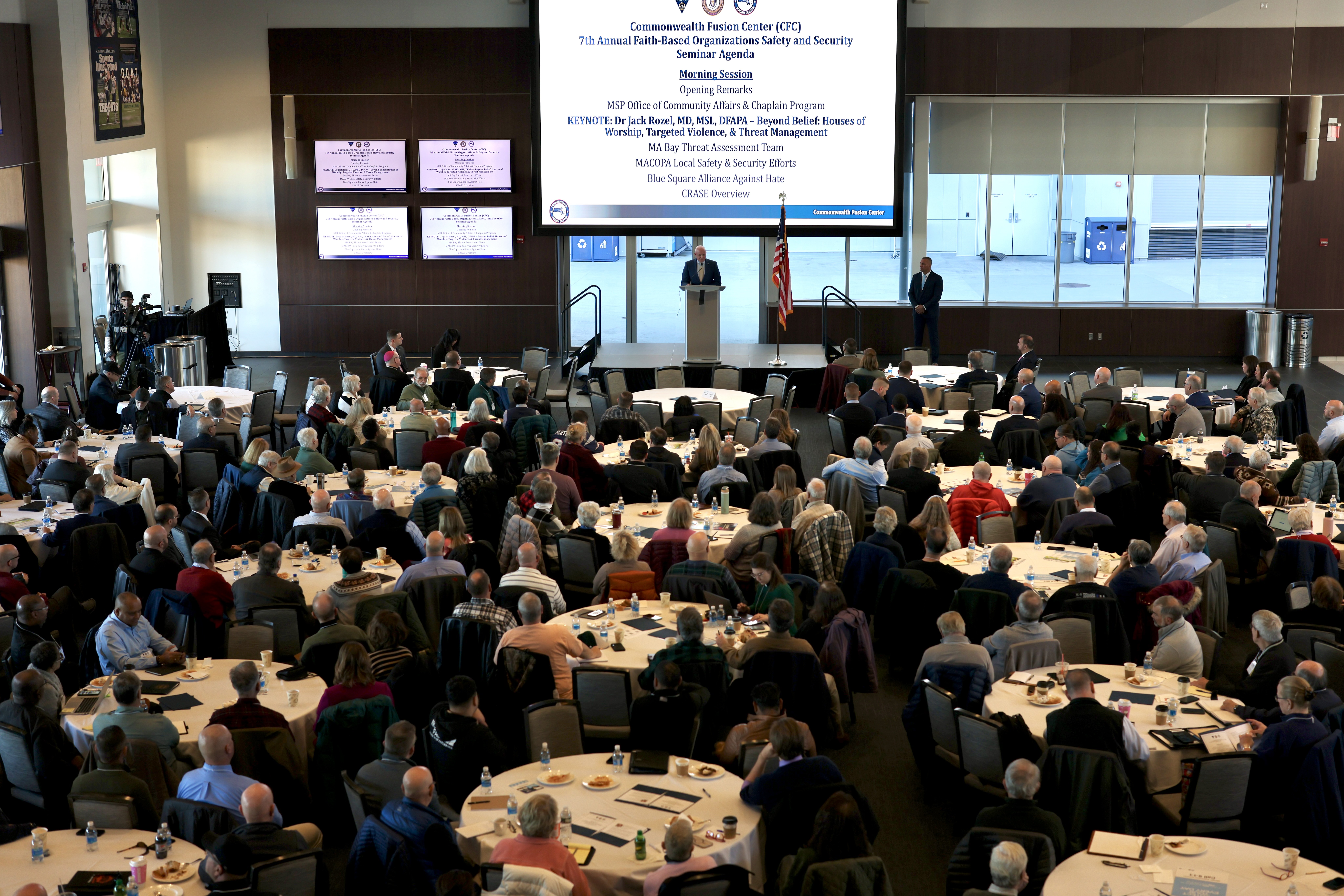 Foxborough — Today, the Massachusetts State Police and the Commonwealth Fusion Center convened nearly 400 leaders for the 7th Annual Faith-Based Organizations Safety & Security Seminar. Hosted by the Kraft Family at Gillette Stadium’s Sports Illustrated Pavilion, the program delivered national best practices to empower leaders to secure their physical spaces and maintain safe environments for residents who come to worship and access supportive social services.