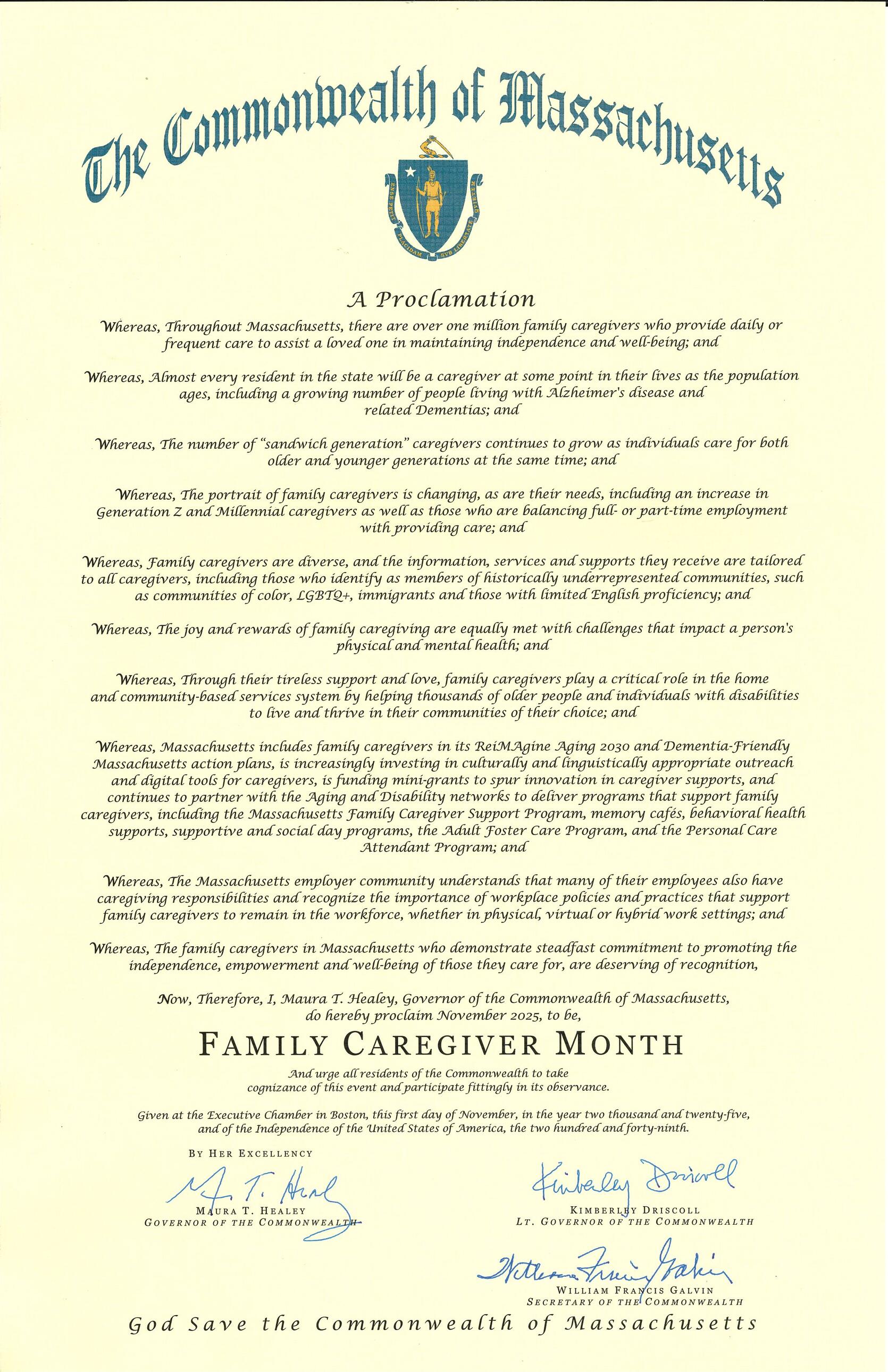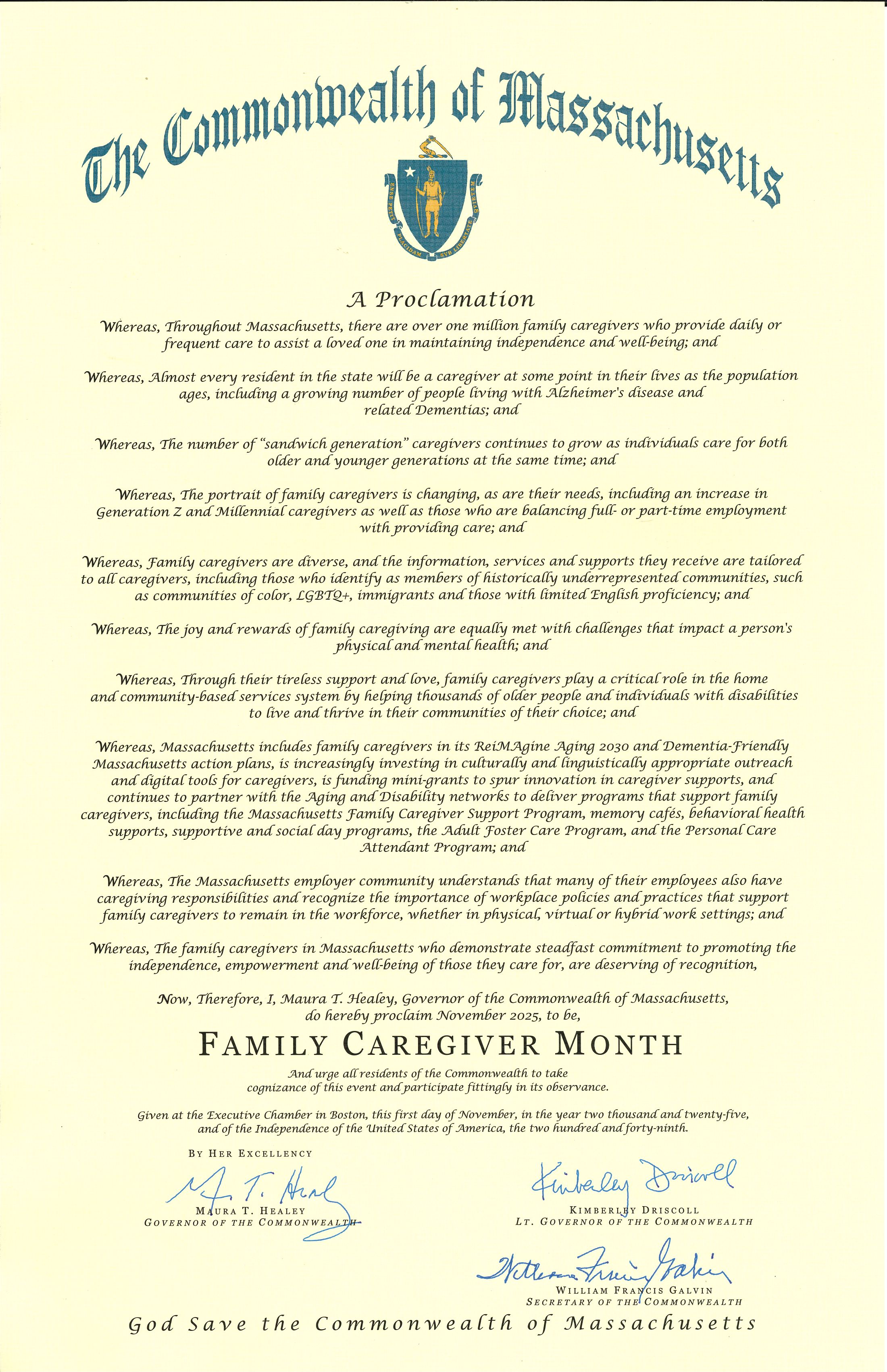 Whereas, Massachusetts includes family caregivers in its ReiMAgine Aging 2030 and Dementia-Friendly Massachusetts action plans, is increasingly investing in culturally and linguistically appropriate outreach and digital tools for caregivers, is funding mini-grants to spur innovation in caregiver supports, and continues to partner with the Aging and Disability networks to deliver programs that support family caregivers, including the Massachusetts Family Caregiver Support Program, memory cafés, behavioral health supports, supportive and social day programs, the Adult Foster Care Program, and the Personal Care Attendant Program, and;