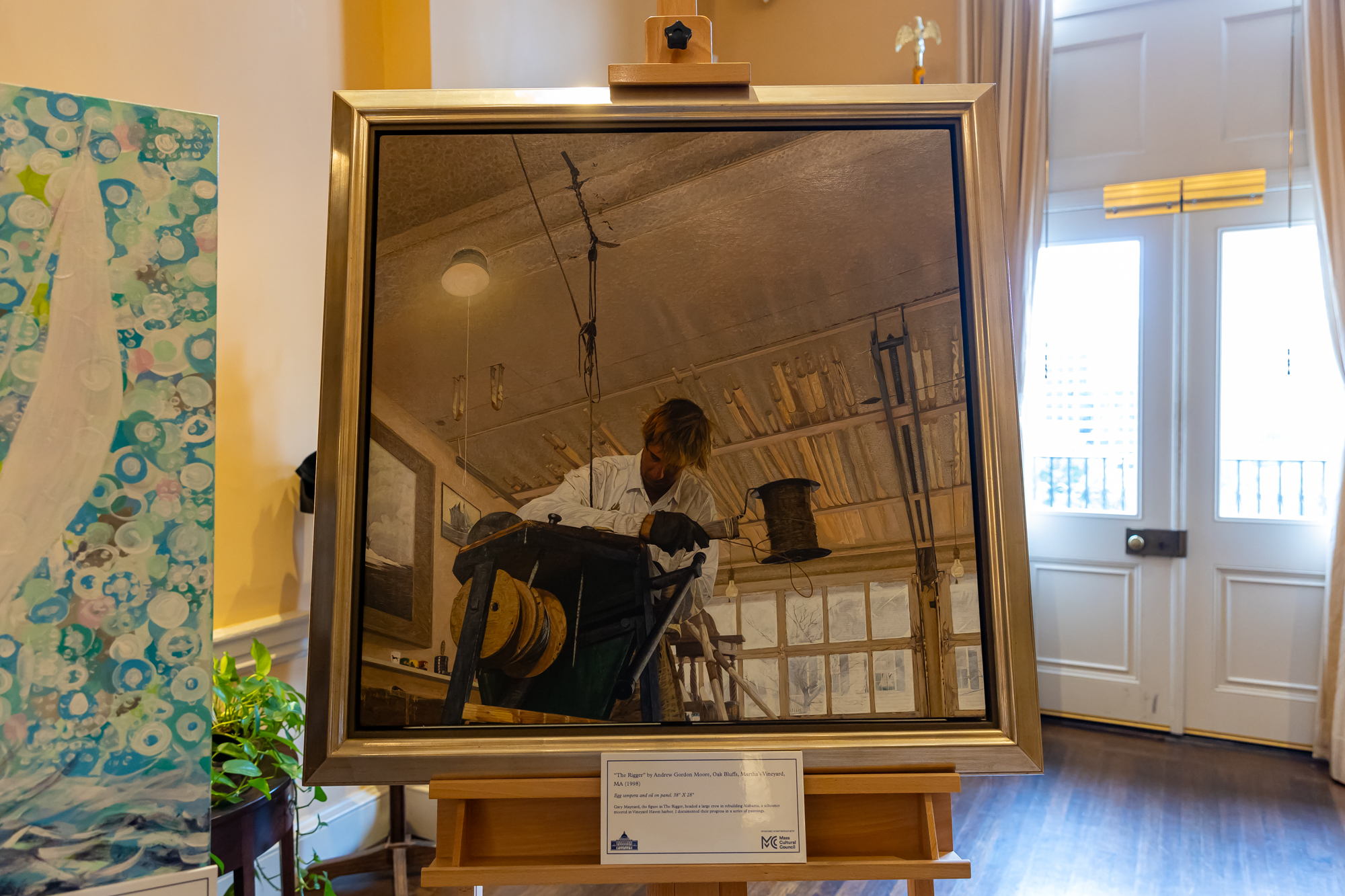 Two of his works, The RiggerandInto the Blue, are both on display in the Governor’s reception area. The Rigger (egg tempera with oil glazes) depicts boatwright Gary Maynard working on the rigging of Alabama, a ninety-foot-long sloop moored in Vineyard haven Harbor. Into the Blue (oil on linen) depicts a walking path worn through the beach grass covered barrier dune, leading to the ocean. Here the beach grass is interspersed with September’s blossoming goldenrod. Hand painted monarch butterflies adorn the frame, pointing out the symbiotic relationship between these migrating butterflies and the fuel rich goldenrod nectar. Andrew is pleased to be part of this exhibition and to represent the numerous skilled painters living and working on the Cape and Islands.