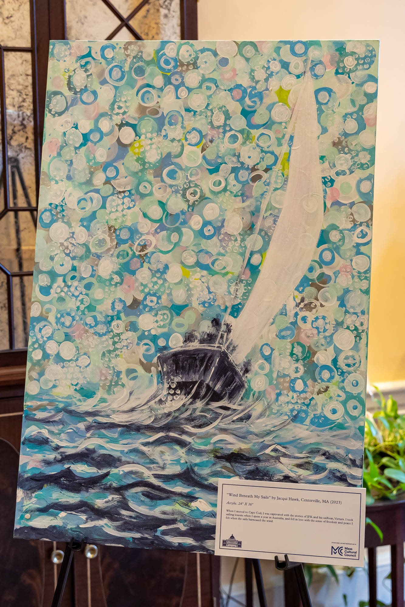 Her work, Wind Beneath My Sails, is on display at the Governor’s office. An acrylic-based painting, Jacqui showcases a sailboat riding the waves of the sea with an abstract dot-like background to encapsulate the range of colors in the sky. By mixing the landscape and abstract elements of the work, Jacqui is able to add a joyfulness to the ocean to represent the sense of freedom and peace that blows the sail forward.