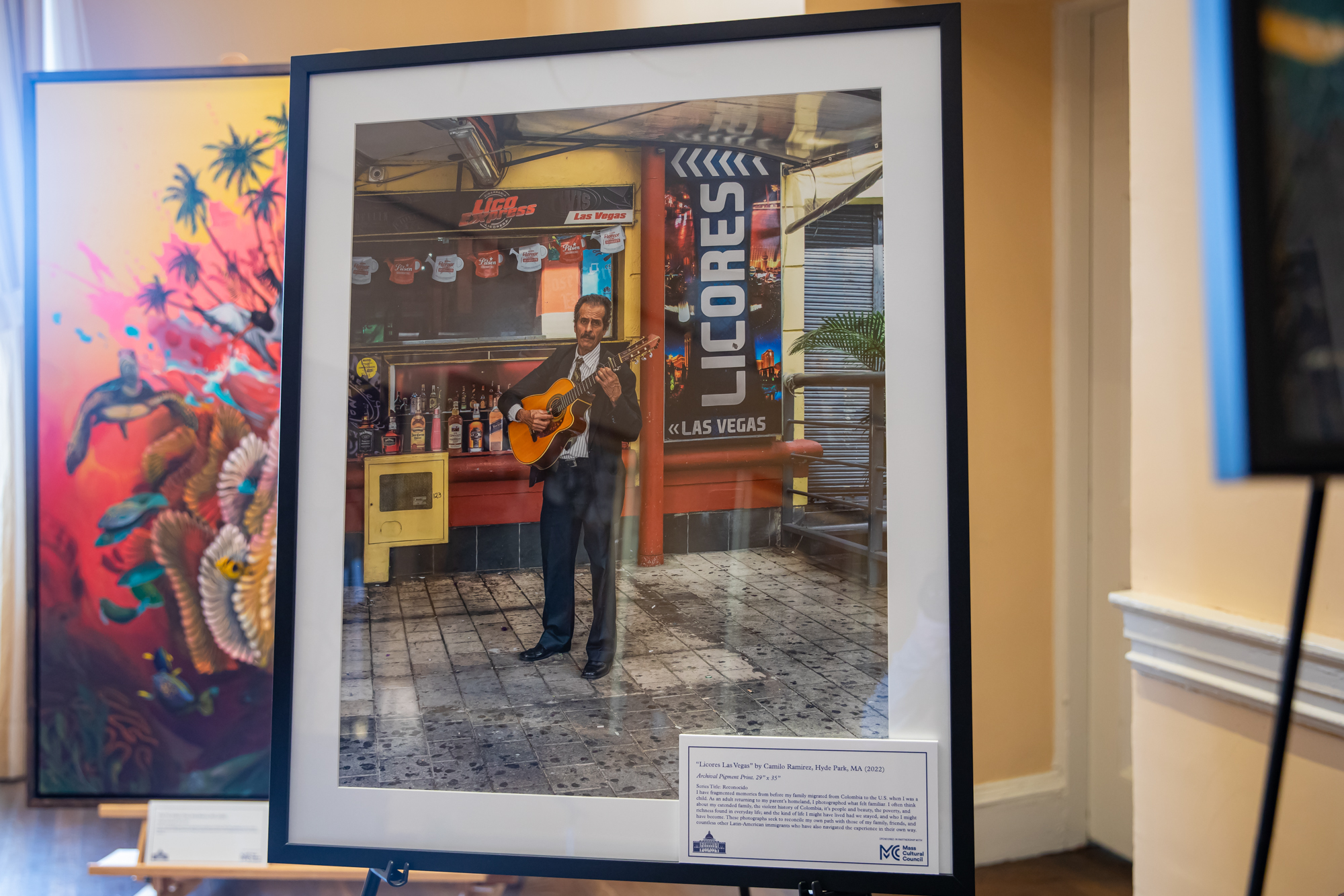Camilo Ramirez is a Colombian American photographer based in Boston, MA. His projects explore the straddling of American and Colombian culture as seen in the landscape and through personal projects around family. Two of his work, “La Tertuila” and “Licores Las Vegas” are both on display in the Governor’s reception area.