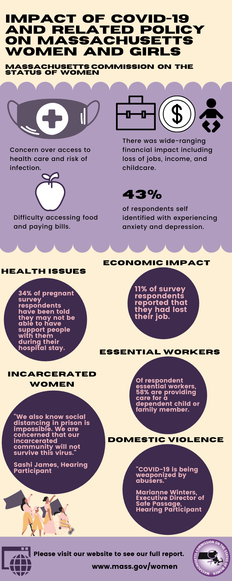 Boston, MA — The Commission on the Status of Women (CSW) has released a report on “The Impact of COVID-19 and Related Policy on Massachusetts Women and Girls.” The Report includes key findings and areas for immediate attention in the following categories: