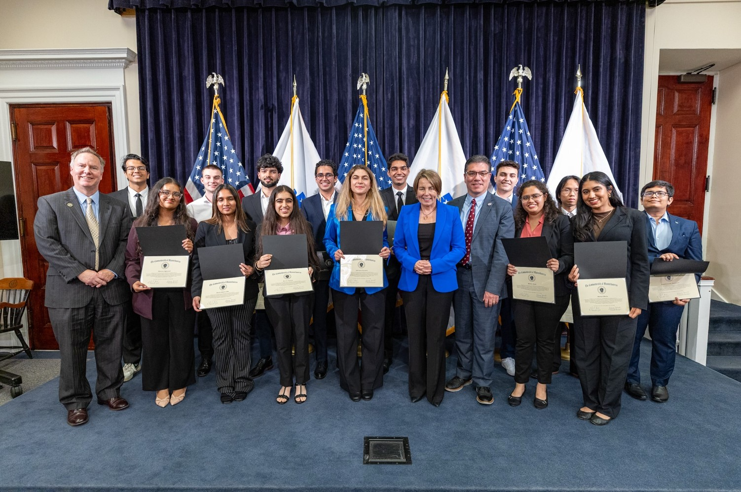 Boston — Governor Maura Healey hosted students from the University of Massachusetts-Amherst’s Manning College of Information and Computer Sciences for an Artificial Intelligence (AI) showcase. The event highlighted the students’ AI innovations addressing real-world challenges in state government as part of the AI for the Commonwealth (AI4CW) initiative. Governor Healey was joined by UMass-Amherst Chancellor Javier Reyes, faculty and administration from the university, and Technology Services and Security Secretary Jason Snyder to view the students’ presentations.