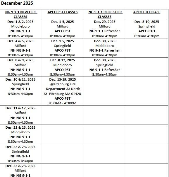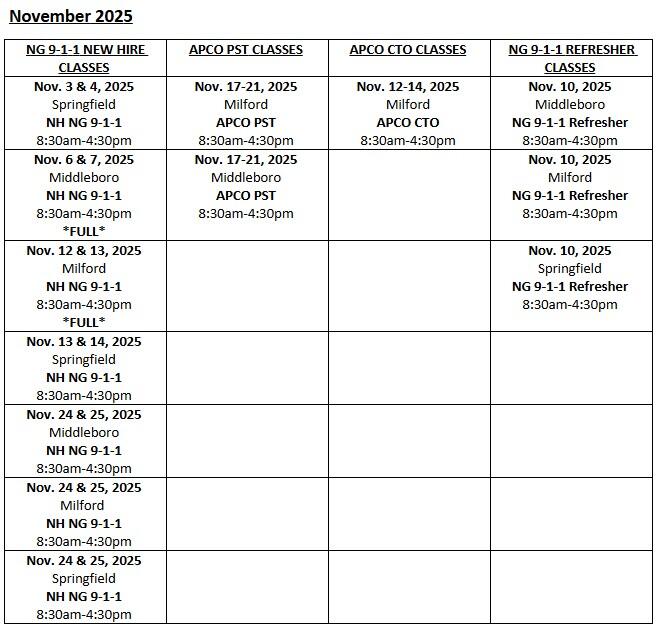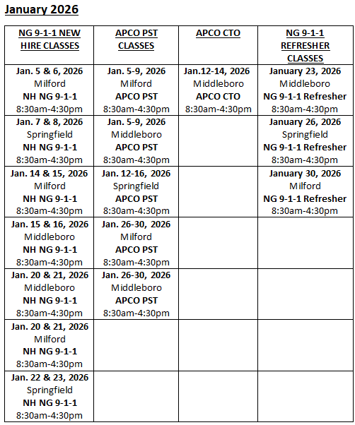 The scheduled trainings on the below calendars are only available for newly hired staff at a Massachusetts 9-1-1 call center.